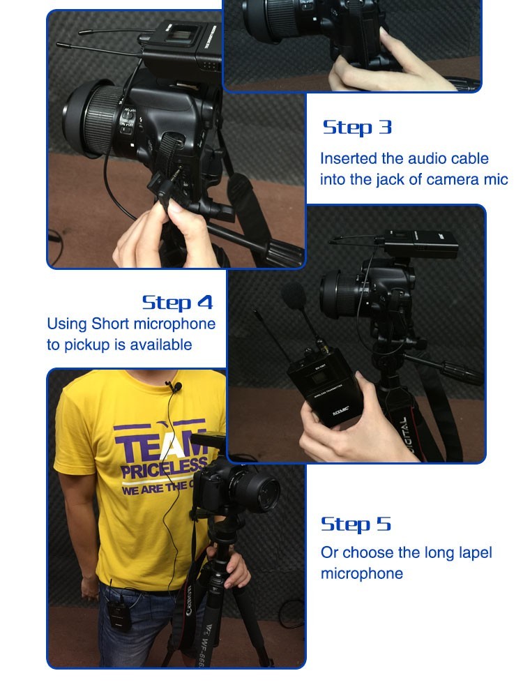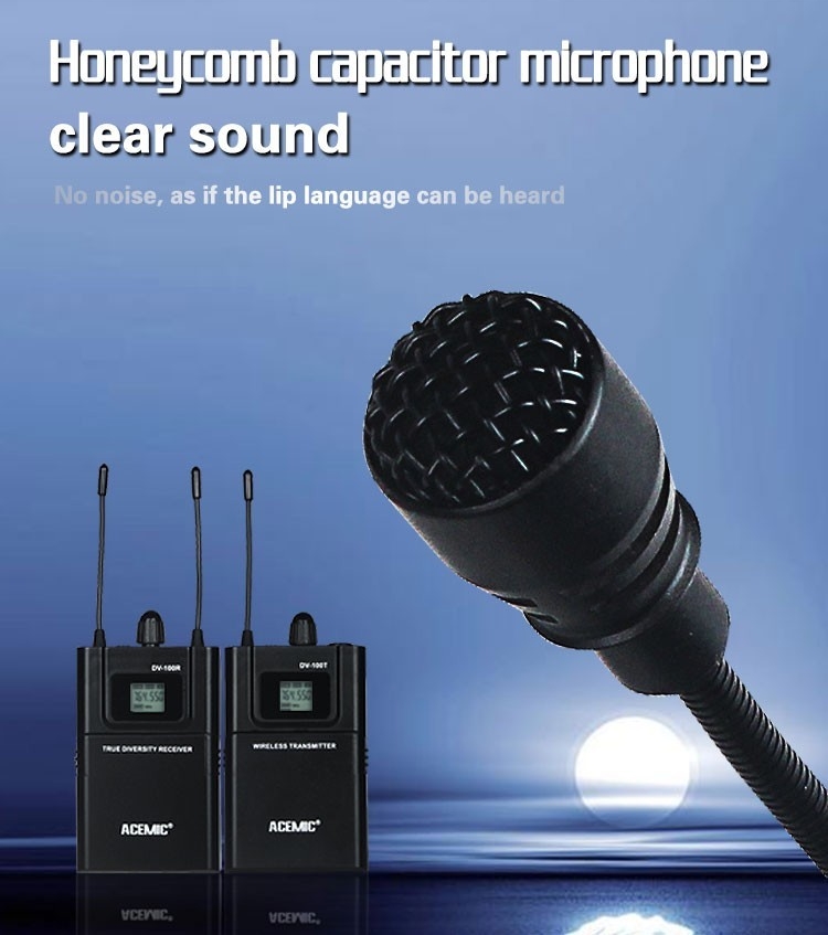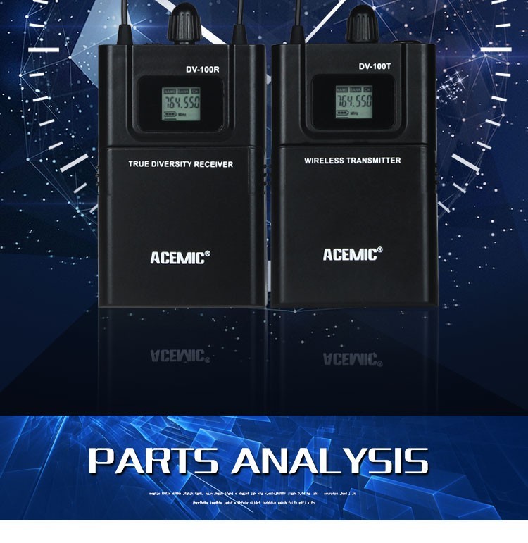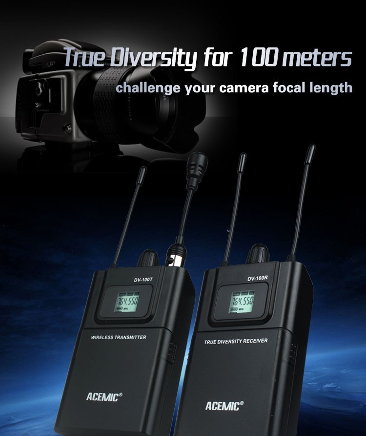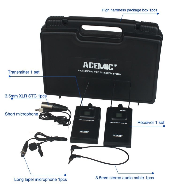 Acemic DV-100 Transmitter Receiver Mic True Diversity Interview Wireless Microphone System Special designed for DSLR Carema/DV Applications Features: UHF 740-765MHz frequency range True diversity for maximun range and dropout protection PLL Synthesized circuit, pre-set 100 selectable frequencies IR sync downloading the frequency from receiver LCD display shows status of frequency, AF and RF signal etc Up to 300 feet(100m) line-of-sight operating range Special designed for Carema/DV applications Specifications: Comprehensive Performance: Frequency Range: 600-928MHz Modulation Mode: FM Dynamic Range: >100dB Frequency Response: 60Hz-17KHz3dB Total Harmonic Distortion: <0.5% at 1KHz Signal/Noise Ratio: ?105dB Receiver: Frequency Range: 740-765MHz frequency range Receive Sensitivity: -110dBm (sinad ?30dB) Signal/Noise Ratio: >105dB Audio Output: 1*3.5mm jack socket Transmitter: Frequency Range: 740-765MHz frequency range RF Power: 10mW Microphone Type: Condensor Directivity; Cardioid Battery Voltage: 3V (2x1.5V AA Battery) Power Consumption: 8 hours, battery-dependent Package Including: 1* Transmitter 1* Receiver 1* 3.5mm XLR STC 1* Short microphone 1* Long lapel microphones 1* 3.5mm stereo audio cable 1* Package Box