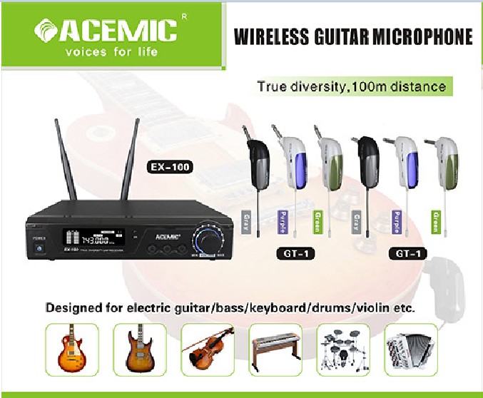 FEATURES UHF740-790frequency range( region dependant) True diveristy for maximum range and dropout portection, 100 meters line of sight range. Super anti-interference capability ensures 10 systems can use together without interference High-fidelity sound quality, no loss while wireless transmission compare to the cable. Pre-set 100 (10*10) frequency seletable, IR synchronization. LCD display shows the group, channel, frequency and RF, AF levels. EIA standard 1/2 rack mountable metal chassis. No more the bodypack transmitters, plug-in transmitter design. Transmitter power supplied by one AA 1.5V battery, battery life more than 12hours Special designed for electric guitar, bass, keyborad, drums violin and all 6.35mm jack electric instrument applications SPECIFICATION Comprehensive Performance Frequency Range: 600-952MHz Modulation Mode: FM Dynamic Range: >100dB Frequency Response: 40Hz-17KHz3dB Total Harmonic Distortion: <0.5% at 1KHz Signal/Noise Ratio: ?108dB Receiver Frequency Range: 600-952MHz Receive Sensitivity: -110dBm (sinad ?30dB) Signal/Noise Ratio: >105dB Power Supply: DC12V / 500mA Audio Output: 1*XLR socket, 1*6.35mm jack socket Transmitter Frequency Range: 600-952MHz RF Power: 10mW Frequency Deviation: 48KHz Antenna: 1/4 wave Length wire type Battery Voltage: 1.5V (1x1.5V AA Battery) Power Consumption: 10 hours, battery-dependent
